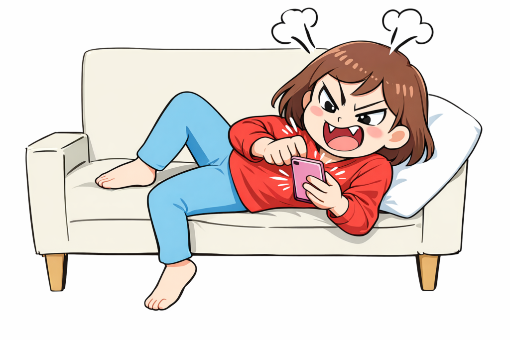 (上手くゲームができないのか、キレながらスマホタップする嫁)